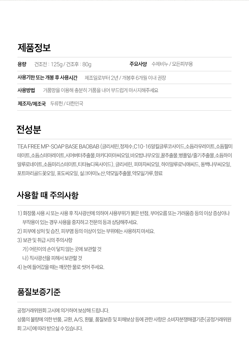 TEA FREE MP-SOAP BASE BAOBAB (글리세린,정제수,C10-16알킬글루코사이드,소듐라우레이트,소듐팔미테이트,소듐스테아레이트,시어버터추출물,마카다미아씨오일,바오밥나무오일,꿀추출물,병풀잎/줄기추출물,소듐하이알루로네이트,소듐미리스테이트,티타늄디옥사이드), 글리세린, 피마자씨오일, 하이알루로닉애씨드, 동백나무씨오일, 포트마리골드꽃오일, 포도씨오일, 실크아미노산,약모밀추출물,약모밀가루,향료